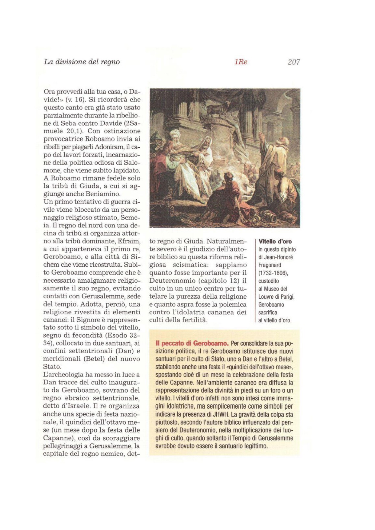 26Geroboamo pensò: «In questa situazione il regno potrà tornare alla casa di Davide. 27Se questo popolo continuerà a salire a Gerusalemme per compiervi sacrifici nel tempio del Signore, il cuore di questo popolo si rivolgerà verso il suo signore, verso Roboamo, re di Giuda; mi uccideranno e ritorneranno da Roboamo, re di Giuda». 28Consigliatosi, il re preparò due vitelli d'oro e disse al popolo: «Siete già saliti troppe volte a Gerusalemme! Ecco, Israele, i tuoi dèi che ti hanno fatto salire dalla terra d'Egitto». 29Ne collocò uno a Betel e l'altro lo mise a Dan. 30Questo fatto portò al peccato; il popolo, infatti, andava sino a Dan per prostrarsi davanti a uno di quelli.