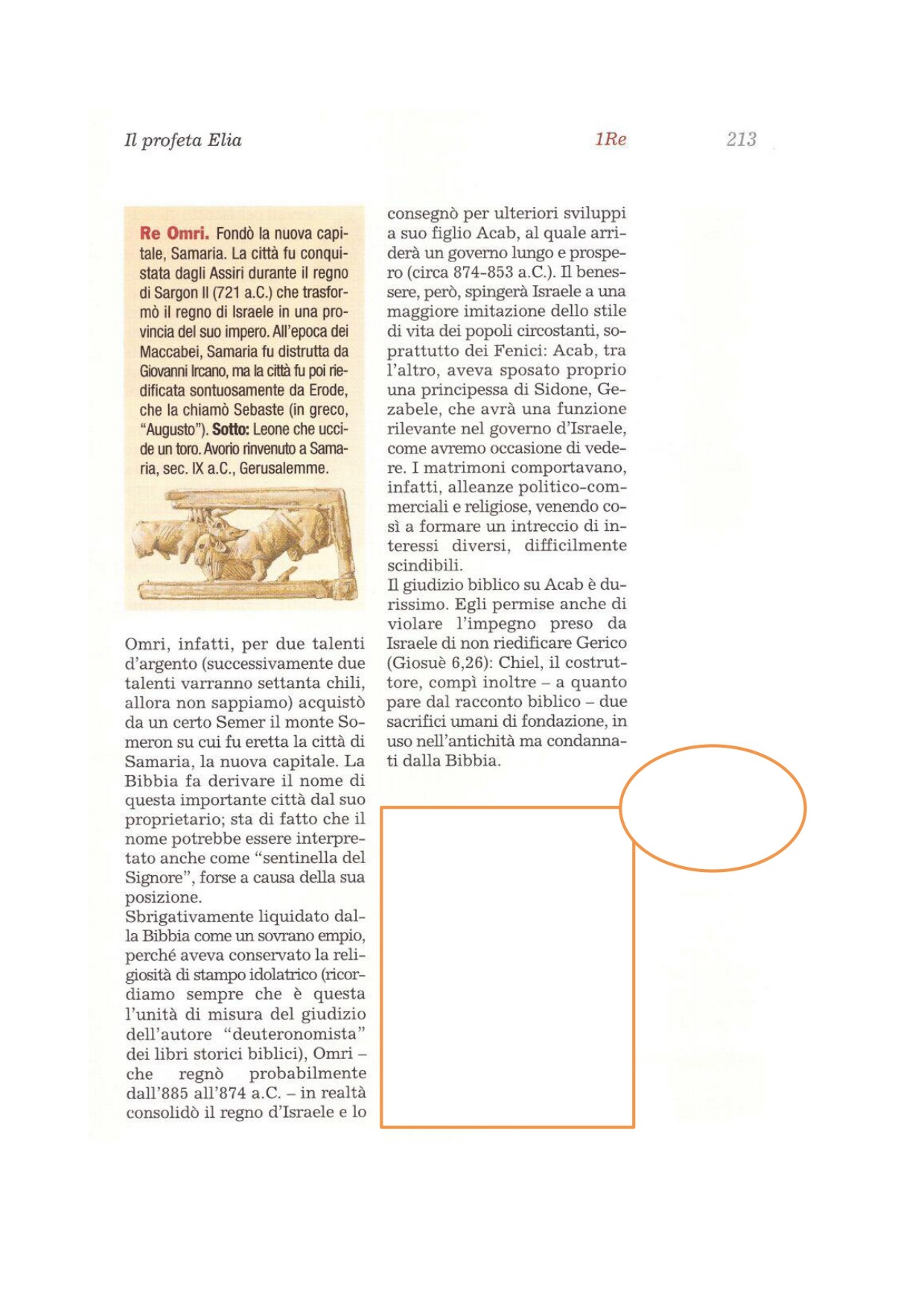 29Acab, figlio di Omri, divenne re su Israele nell'anno trentottesimo di Asa, re di Giuda. Acab, figlio di Omri, regnò su Israele a Samaria ventidue anni. 30Acab, figlio di Omri, fece ciò che è male agli occhi del Signore, più di tutti quelli prima di lui. 31Non gli bastò imitare il peccato di Geroboamo, figlio di Nebat, ma prese anche in moglie Gezabele, figlia di Etbàal, re di quelli di Sidone, e si mise a servire Baal e a prostrarsi davanti a lui. 32Eresse un altare a Baal nel tempio di Baal, che egli aveva costruito a Samaria. 33Acab eresse anche il palo sacro e continuò ad agire provocando a sdegno il Signore, Dio d'Israele, più di tutti i re d'Israele prima di lui.