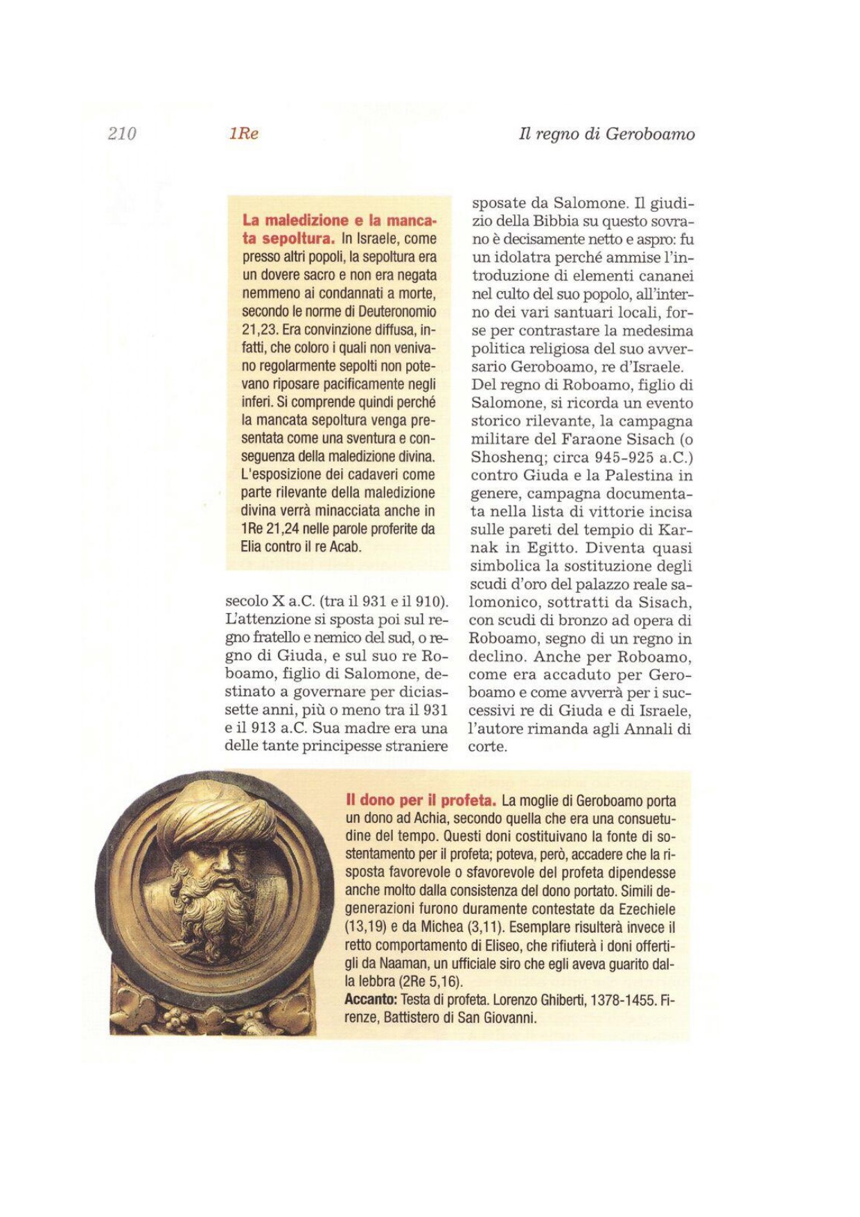 5Il Signore aveva detto ad Achia: «Ecco, la moglie di Geroboamo viene per chiederti un oracolo sul figlio, che è malato; tu le dirai questo e questo. Arriverà travestita». 6Appena Achia sentì il rumore dei piedi di lei che arrivava alla porta, disse: «Entra, moglie di Geroboamo. Perché ti fingi un'altra? Io sono stato incaricato di annunciarti una dura notizia. 7Su, riferisci a Geroboamo: Così dice il Signore, Dio d'Israele: «Io ti ho innalzato fra il popolo costituendoti capo del popolo d'Israele, 8ho strappato il regno dalla casa di Davide e l'ho consegnato a te. Ma tu non sei stato come il mio servo Davide, che osservò i miei comandi e mi seguì con tutto il suo cuore, facendo solo ciò che è retto davanti ai miei occhi, 9anzi hai agito peggio di tutti quelli che furono prima di te e sei andato a fabbricarti altri dèi e immagini fuse per provocarmi, mentre hai gettato me dietro alle tue spalle. 10Per questo, ecco, manderò la sventura sulla casa di Geroboamo, distruggerò nella casa di Geroboamo ogni maschio, schiavo o libero in Israele, e spazzerò la casa di Geroboamo come si spazza lo sterco fino alla sua totale scomparsa. 11I cani divoreranno quanti della casa di Geroboamo moriranno in città; quelli morti in campagna li divoreranno gli uccelli del cielo, perché il Signore ha parlato». 12Ma tu àlzati, va' a casa tua; quando i tuoi piedi raggiungeranno la città, il bambino morirà. 13Ne faranno il lamento tutti gli Israeliti e lo seppelliranno; infatti soltanto lui della famiglia di Geroboamo entrerà in un sepolcro, perché in lui si è trovato qualcosa di buono da parte del Signore, Dio d'Israele, nella famiglia di Geroboamo. 14Il Signore farà sorgere per sé un re sopra Israele, che distruggerà la famiglia di Geroboamo. Questo è quel giorno! Non è forse già adesso? 15Inoltre il Signore percuoterà Israele, come una canna agitata dall'acqua. Eliminerà Israele da questa terra buona che ha dato ai loro padri e li disperderà oltre il Fiume, perché si sono eretti i loro pali sacri, provocando così il Signore. 16Il Signore abbandonerà Israele a causa dei peccati di Geroboamo, il quale peccò e fece peccare Israele».