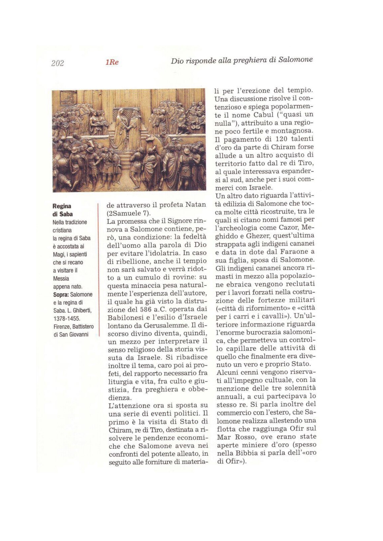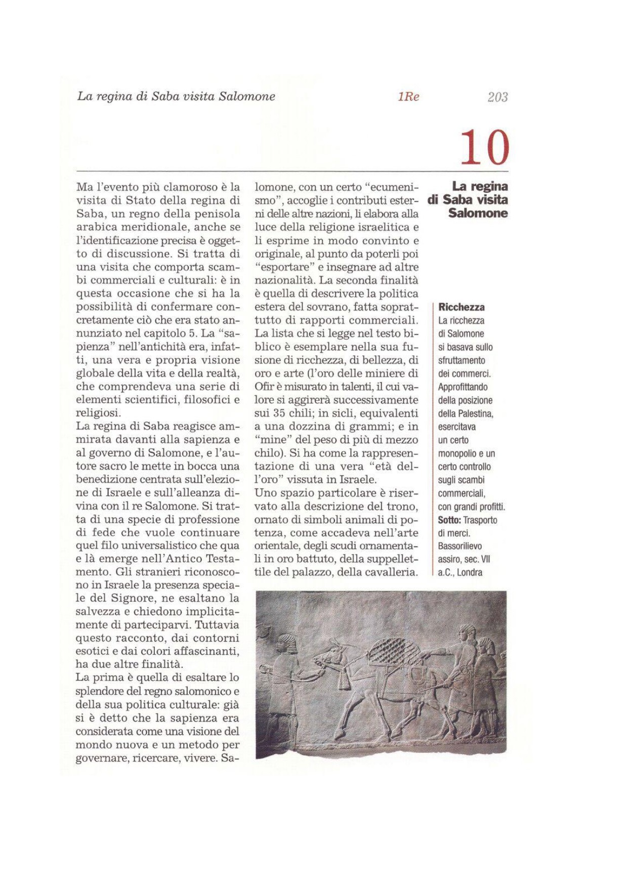 1 La regina di Saba, sentita la fama di Salomone, dovuta al nome del Signore, venne per metterlo alla prova con enigmi. 2Arrivò a Gerusalemme con un corteo molto numeroso, con cammelli carichi di aromi, d'oro in grande quantità e di pietre preziose. Si presentò a Salomone e gli parlò di tutto quello che aveva nel suo cuore. 3Salomone le chiarì tutto quanto ella gli diceva; non ci fu parola tanto nascosta al re che egli non potesse spiegarle.