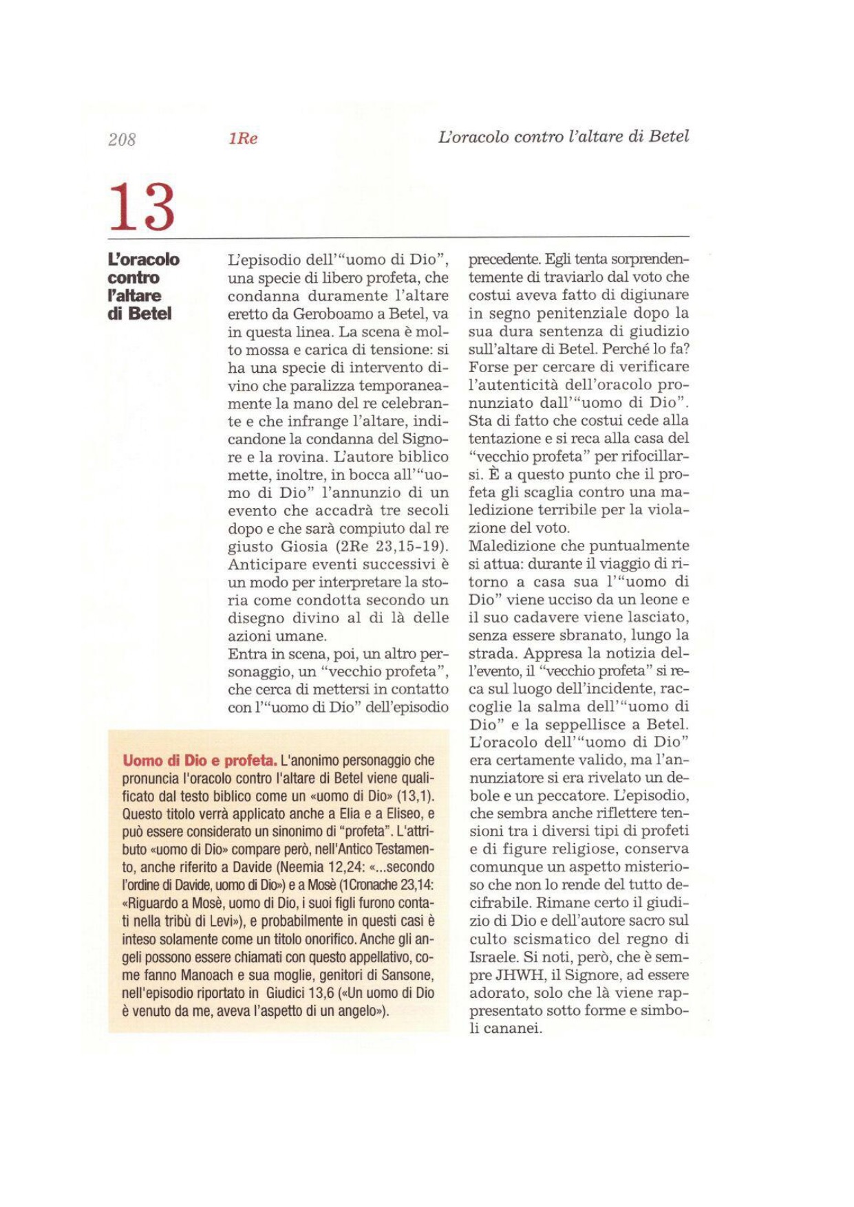 1 Un uomo di Dio, per comando del Signore, si portò da Giuda a Betel, mentre Geroboamo stava presso l'altare per offrire incenso. 2Per comando del Signore quegli gridò verso l'altare: «Altare, altare, così dice il Signore: «Ecco, nascerà un figlio nella casa di Davide, chiamato Giosia, il quale immolerà su di te i sacerdoti delle alture, che hanno offerto incenso su di te, e brucerà su di te ossa umane»». 3In quel giorno diede un segno, dicendo: «Questo è il segno che il Signore parla: ecco, l'altare si spezzerà e sarà sparsa la cenere che vi è sopra». 4Appena sentì la parola che l'uomo di Dio aveva proferito contro l'altare di Betel, il re Geroboamo tese la mano ritirandola dall'altare dicendo: «Afferratelo!». Ma la sua mano, tesa contro quello, gli si inaridì e non la poté far tornare a sé. 5L'altare si spezzò e fu sparsa la cenere dell'altare, secondo il segno dato dall'uomo di Dio per comando del Signore. 6Presa la parola, il re disse all'uomo di Dio: «Placa il volto del Signore, tuo Dio, e prega per me, perché mi sia resa la mia mano». L'uomo di Dio placò il volto del Signore e la mano del re gli tornò com'era prima. 7All'uomo di Dio il re disse: «Vieni a casa con me per ristorarti; ti darò un regalo». 8L'uomo di Dio rispose al re: «Anche se mi darai metà della tua casa, non verrò con te e non mangerò pane né berrò acqua in questo luogo, 9perché così mi è stato ordinato per comando del Signore: «Non mangerai pane e non berrai acqua, né tornerai per la strada percorsa nell'andata»». 10Se ne andò per un'altra strada e non tornò per quella che aveva percorso venendo a Betel.