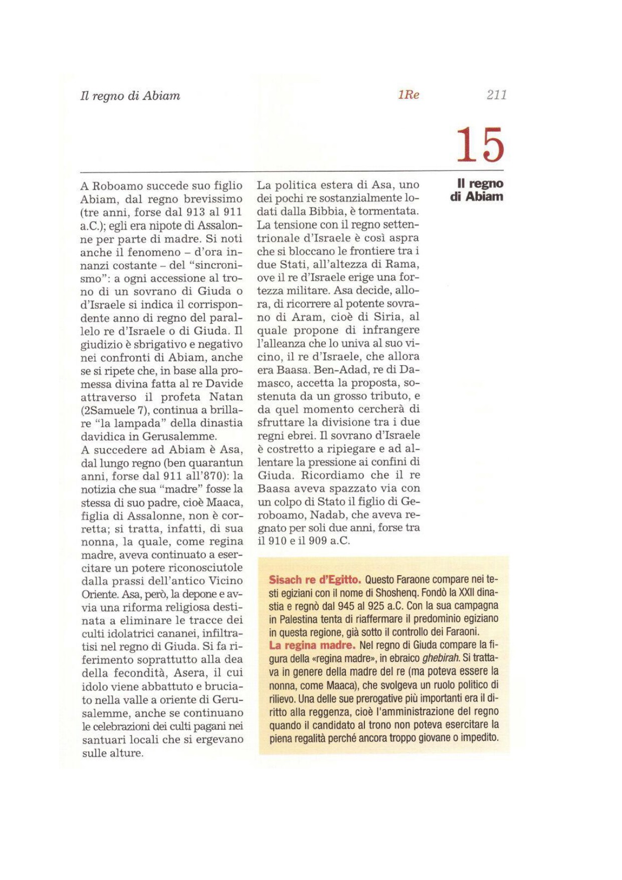 1 Nell'anno diciottesimo del re Geroboamo, figlio di Nebat, Abiam divenne re su Giuda. 2Regnò tre anni a Gerusalemme. Sua madre si chiamava Maacà, figlia di Abisalòm. 3Egli imitò tutti i peccati che suo padre aveva commesso prima di lui; il suo cuore non fu integro con il Signore, suo Dio, come il cuore di Davide, suo padre. 4Ma, per amore di Davide, il Signore, suo Dio, gli concesse una lampada a Gerusalemme, facendo sorgere suo figlio dopo di lui e rendendo stabile Gerusalemme, 5perché Davide aveva fatto ciò che è retto agli occhi del Signore e non aveva deviato da quanto il Signore aveva ordinato, durante tutta la sua vita, se si eccettua il caso di Uria l'Ittita.
