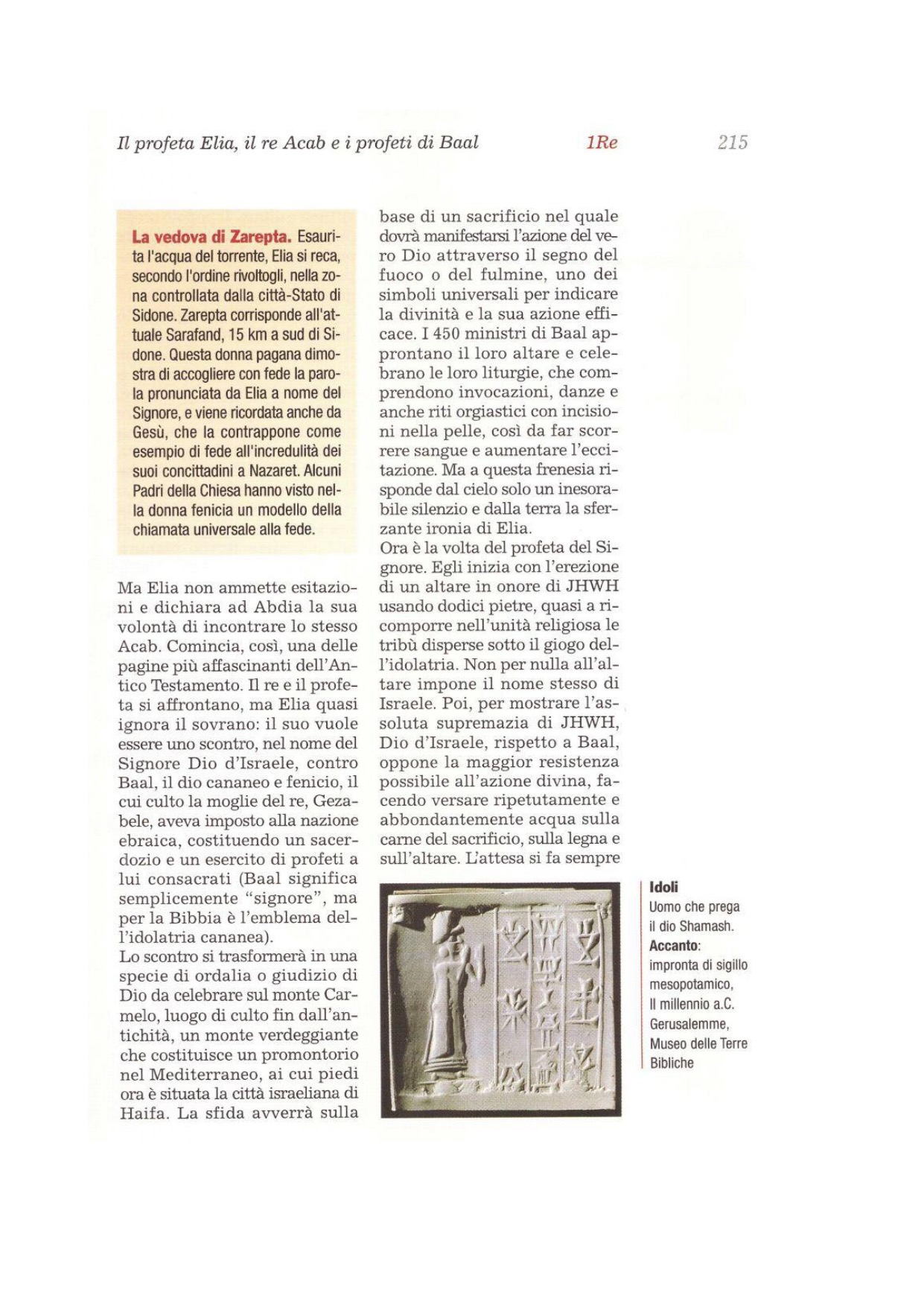 16Abdia andò incontro ad Acab e gli riferì la cosa. Acab si diresse verso Elia. 17Appena lo vide, Acab disse a Elia: «Sei tu colui che manda in rovina Israele?». 18Egli rispose: «Non io mando in rovina Israele, ma piuttosto tu e la tua casa, perché avete abbandonato i comandi del Signore e tu hai seguito i Baal. 19Perciò fa' radunare tutto Israele presso di me sul monte Carmelo, insieme con i quattrocentocinquanta profeti di Baal e con i quattrocento profeti di Asera, che mangiano alla tavola di Gezabele».