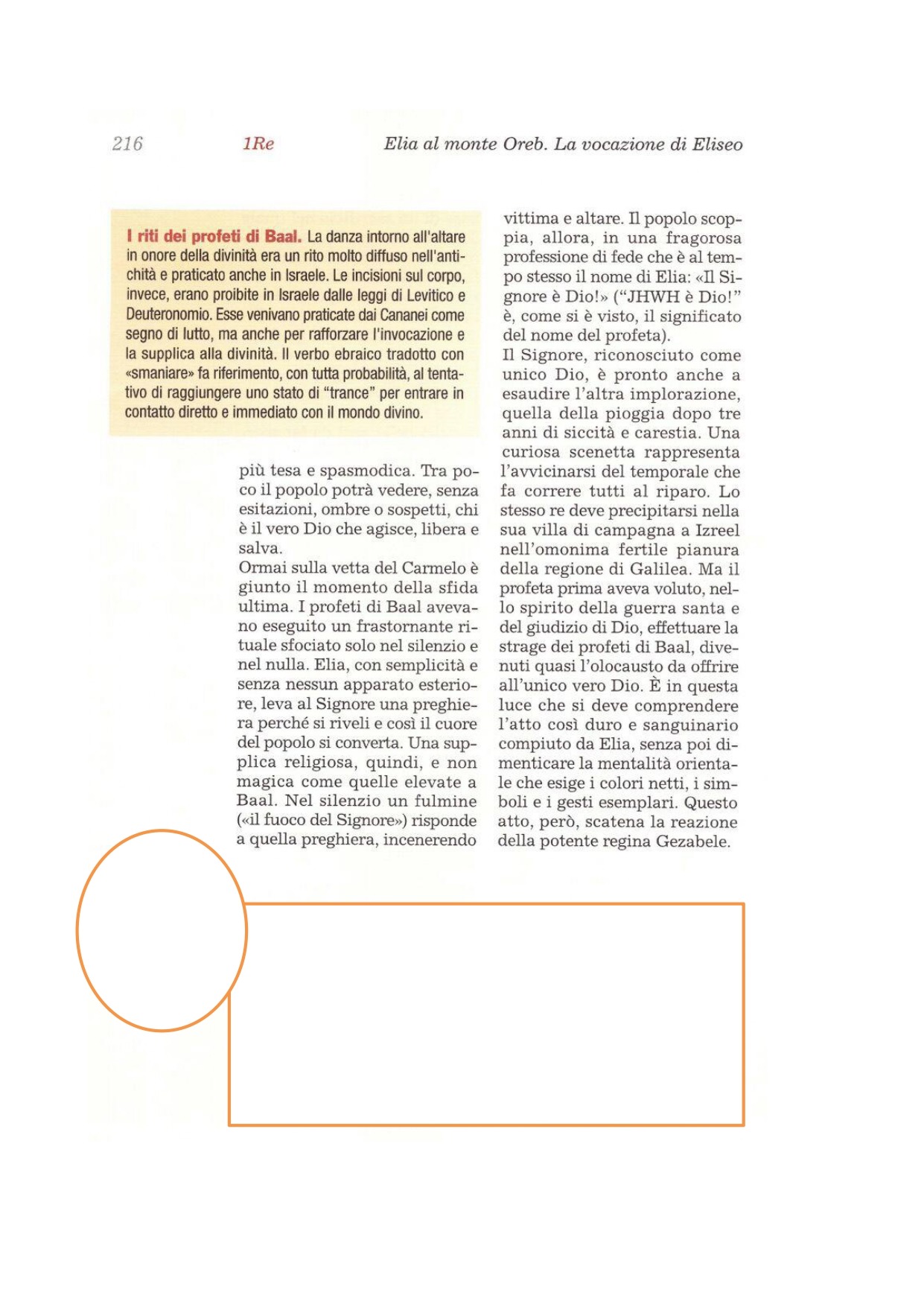 25Elia disse ai profeti di Baal: «Sceglietevi il giovenco e fate voi per primi, perché voi siete più numerosi. Invocate il nome del vostro dio, ma senza appiccare il fuoco». 26Quelli presero il giovenco che spettava loro, lo prepararono e invocarono il nome di Baal dal mattino fino a mezzogiorno, gridando: «Baal, rispondici!». Ma non vi fu voce, né chi rispondesse. Quelli continuavano a saltellare da una parte all'altra intorno all'altare che avevano eretto. 27Venuto mezzogiorno, Elia cominciò a beffarsi di loro dicendo: «Gridate a gran voce, perché è un dio! È occupato, è in affari o è in viaggio; forse dorme, ma si sveglierà». 28Gridarono a gran voce e si fecero incisioni, secondo il loro costume, con spade e lance, fino a bagnarsi tutti di sangue. 29Passato il mezzogiorno, quelli ancora agirono da profeti fino al momento dell'offerta del sacrificio, ma non vi fu né voce né risposta né un segno d'attenzione.