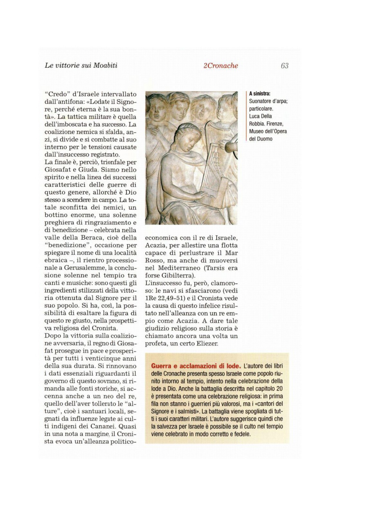 20La mattina dopo si alzarono presto e partirono per il deserto di Tekòa. Mentre si muovevano, Giòsafat si fermò e disse: «Ascoltatemi, Giuda e abitanti di Gerusalemme! Credete nel Signore, vostro Dio, e sarete saldi; credete nei suoi profeti e riuscirete». 21Quindi, consigliatosi con il popolo, mise i cantori del Signore e i salmisti, vestiti con paramenti sacri, schierati davanti agli uomini in armi, perché lodassero il Signore dicendo: