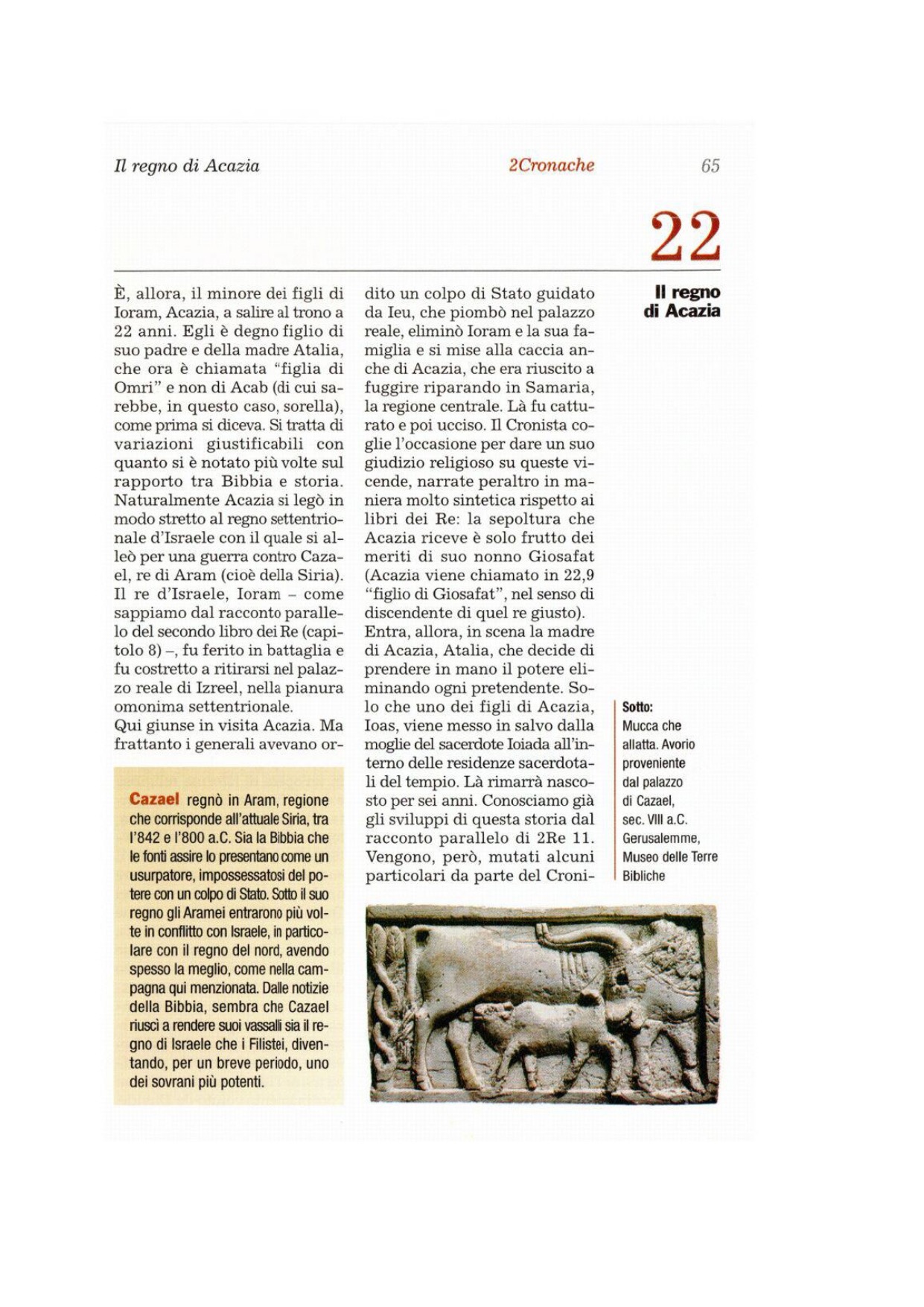 1 Gli abitanti di Gerusalemme proclamarono re al suo posto Acazia, il minore dei figli, perché tutti quelli più anziani erano stati uccisi dalla banda che era penetrata con gli Arabi nell'accampamento. Così divenne re Acazia, figlio di Ioram, re di Giuda. 2Quando divenne re, Acazia aveva quarantadue anni; regnò un anno a Gerusalemme. Sua madre si chiamava Atalia ed era figlia di Omri. 3Anch'egli seguì la via della casa di Acab, perché sua madre lo consigliava ad agire da malvagio. 4Fece ciò che è male agli occhi del Signore, come la casa di Acab, perché dopo la morte di suo padre, costoro, per sua rovina, erano i suoi consiglieri. 5Su loro consiglio egli andò alla guerra con Ioram, figlio di Acab, re d'Israele, contro Cazaèl, re di Aram, a Ramot di Gàlaad; ma gli Aramei ferirono Ioram, 6che tornò a curarsi a Izreèl per le ferite ricevute a Rama, mentre combatteva contro Cazaèl, re di Aram. Acazia, figlio di Ioram, re di Giuda, scese a visitare Ioram, figlio di Acab, a Izreèl, perché era malato. 7Fu volontà di Dio che Acazia, per sua rovina, andasse da Ioram. Difatti, quando giunse, uscì con Ioram incontro a Ieu, figlio di Nimsì, che il Signore aveva unto perché distruggesse la casa di Acab. 8Mentre faceva giustizia della casa di Acab, Ieu trovò i comandanti di Giuda e i nipoti di Acazia, suoi servi, e li uccise. 9aEgli fece ricercare Acazia e lo catturarono mentre era nascosto a Samaria; lo condussero da Ieu, che lo uccise. Ma lo seppellirono, perché dicevano: «È figlio di Giòsafat, che ha ricercato il Signore con tutto il cuore».
