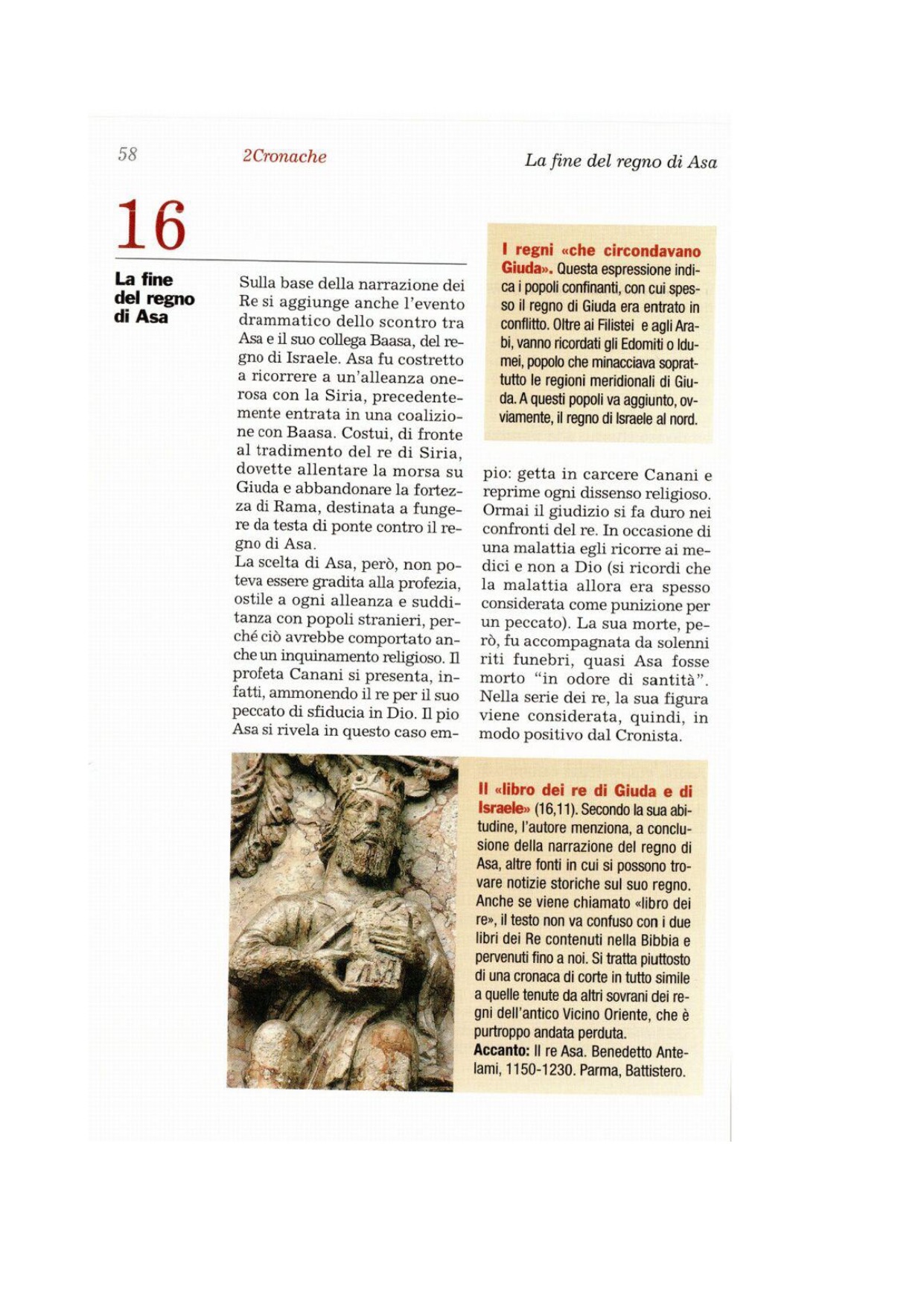 1 Nell'anno trentaseiesimo del regno di Asa, il re d'Israele Baasà salì contro Giuda. Egli fortificò Rama, per impedire il transito ad Asa, re di Giuda. 2Asa estrasse dai tesori del tempio del Signore e della reggia argento e oro e li mandò a Ben-Adàd, re di Aram residente a Damasco, con questa proposta: 3«Ci sia un'alleanza tra me e te, come tra mio padre e tuo padre. Ecco, ti mando argento e oro. Su, rompi la tua alleanza con Baasà, re d'Israele, in modo che egli si ritiri da me». 4Ben-Adàd ascoltò il re Asa; mandò contro le città d'Israele i comandanti del suo esercito, che colpirono Iion, Dan, Abel-Màim e tutte le città di approvvigionamento di Nèftali. 5Quando lo seppe, Baasà smise di fortificare Rama e desistette dalla sua impresa. 6Il re Asa convocò tutti quelli di Giuda, che andarono a prendere le pietre e il legname con cui Baasà stava fortificando Rama, e con essi fortificò Gheba e Mispa.