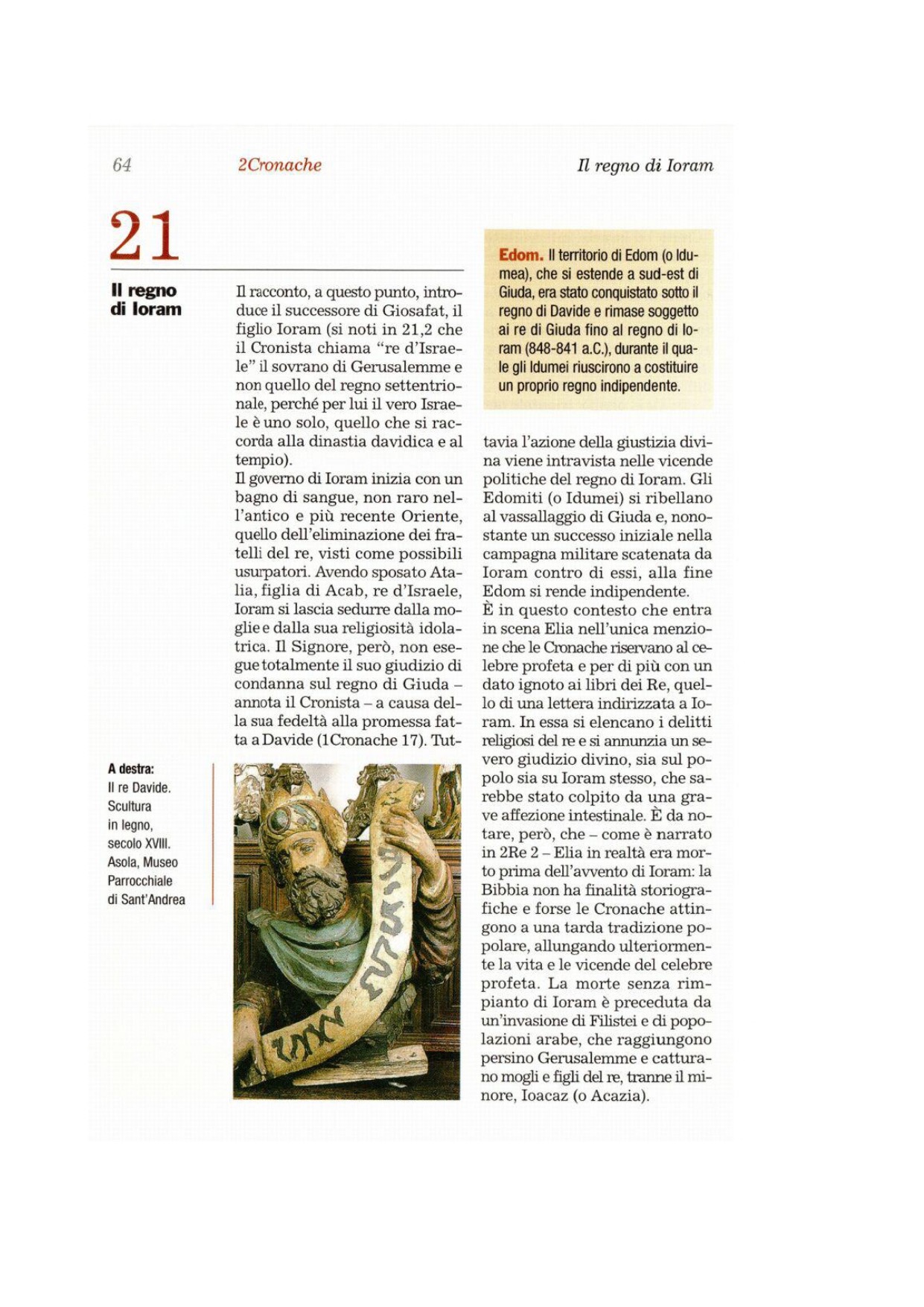 12Gli giunse da parte del profeta Elia uno scritto che diceva: «Dice il Signore, Dio di Davide, tuo padre: «Poiché non hai seguito la via di Giòsafat, tuo padre, né la via di Asa, re di Giuda, 13ma hai seguito la via dei re d'Israele, hai fatto prostituire Giuda e gli abitanti di Gerusalemme, come ha fatto la casa di Acab, e inoltre hai ucciso i tuoi fratelli, della famiglia di tuo padre, uomini migliori di te, 14ecco, il Signore sta per colpire con un grave disastro il tuo popolo, i tuoi figli, le tue mogli e tutti i tuoi beni. 15Tu soffrirai gravi malattie, una malattia intestinale tale che per essa le tue viscere ti usciranno nel giro di due anni»».