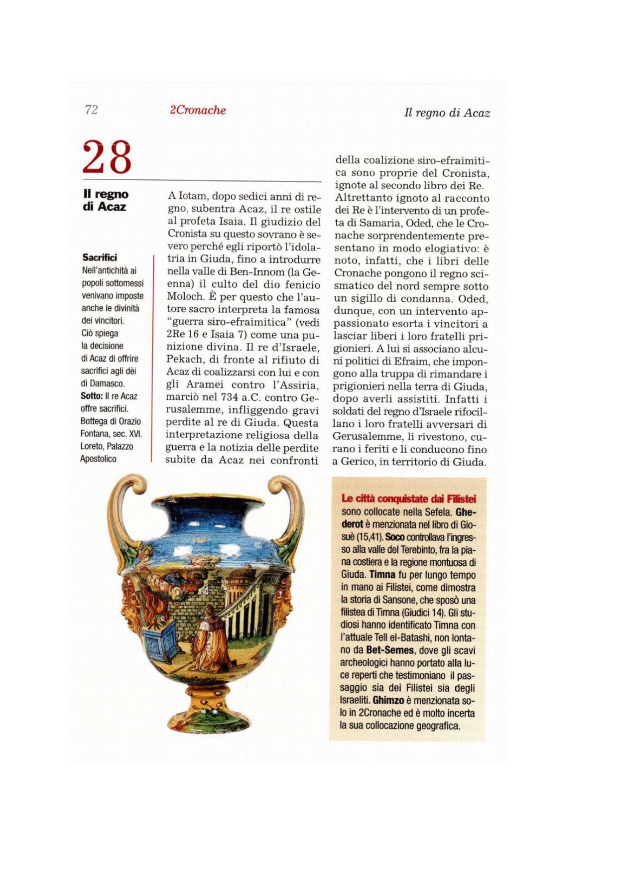 16In quel tempo il re Acaz mandò a chiedere aiuto al re d'Assiria. 17Gli Edomiti erano venuti ancora una volta e avevano sconfitto Giuda e fatto prigionieri. 18Anche i Filistei si erano sparsi per le città della Sefela e del Negheb di Giuda, occupando Bet-Semes, Àialon, Ghederòt, Soco con le dipendenze, Timna con le dipendenze e Ghimzo con le dipendenze, e vi si erano insediati. 19Questo accadde perché il Signore aveva umiliato Giuda a causa di Acaz, re d'Israele, che aveva permesso ogni licenza in Giuda ed era stato infedele al Signore.