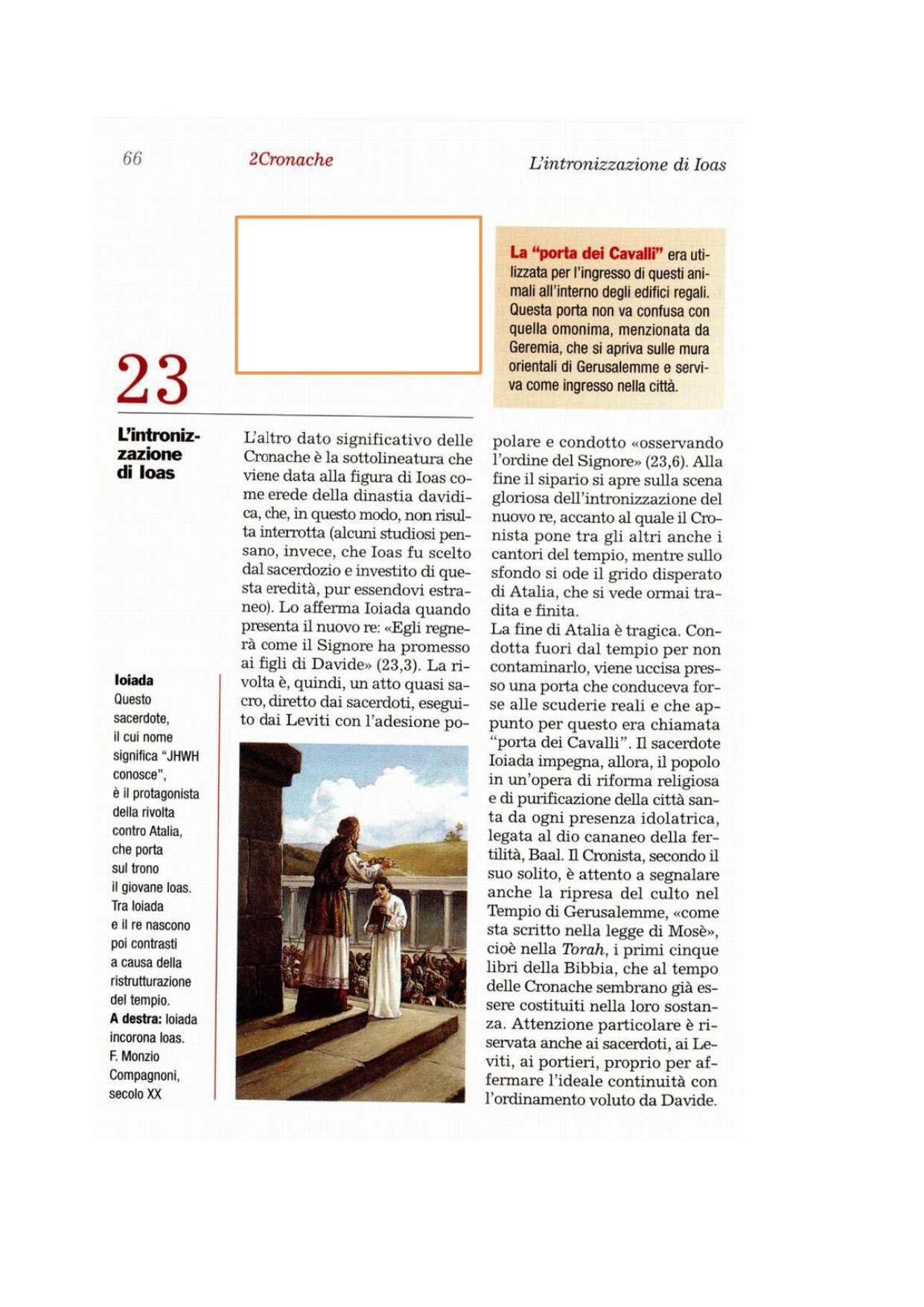 1 Nell'anno settimo Ioiadà, sentendosi sicuro, mandò a prendere i comandanti delle centinaia, cioè Azaria, figlio di Ierocàm, Ismaele, figlio di Giovanni, Azaria, figlio di Obed, Maasia, figlio di Adaià, ed Elisafàt, figlio di Zicrì, e concluse un'alleanza con loro. 2Percorsero Giuda e radunarono i leviti da tutte le città di Giuda e i capi dei casati d'Israele; essi vennero a Gerusalemme. 3Tutta l'assemblea concluse un'alleanza con il re nel tempio di Dio. Ioiadà disse loro: «Ecco il figlio del re. Deve regnare come ha promesso il Signore ai figli di Davide. 4Questo è ciò che dovrete fare: la terza parte di voi che inizia il servizio di sabato, sacerdoti e leviti, farà la guardia alle porte; 5un altro terzo starà nella reggia e un terzo alla porta di Iesod, mentre tutto il popolo starà nei cortili del tempio del Signore. 6Nessuno entri nel tempio del Signore, se non i sacerdoti e i leviti di servizio: costoro vi entreranno, perché sono santi; tutto il popolo osserverà l'ordine del Signore. 7I leviti circonderanno il re, ognuno con l'arma in pugno, e chiunque tenti di entrare nel tempio sia messo a morte. Saranno con il re in tutti i suoi movimenti».