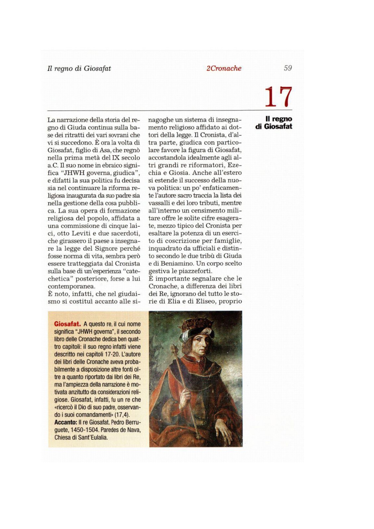 3Il Signore fu con Giòsafat, perché egli camminò sulle vie seguite prima da suo padre e non ricercò i Baal, 4ma piuttosto ricercò il Dio di suo padre e ne seguì i comandi, senza imitare Israele. 5Il Signore consolidò il regno nelle mani di Giòsafat e tutto Giuda gli portava offerte. Egli ebbe ricchezze e gloria in quantità. 6Il suo cuore divenne forte nel seguire il Signore; eliminò anche le alture e i pali sacri da Giuda.