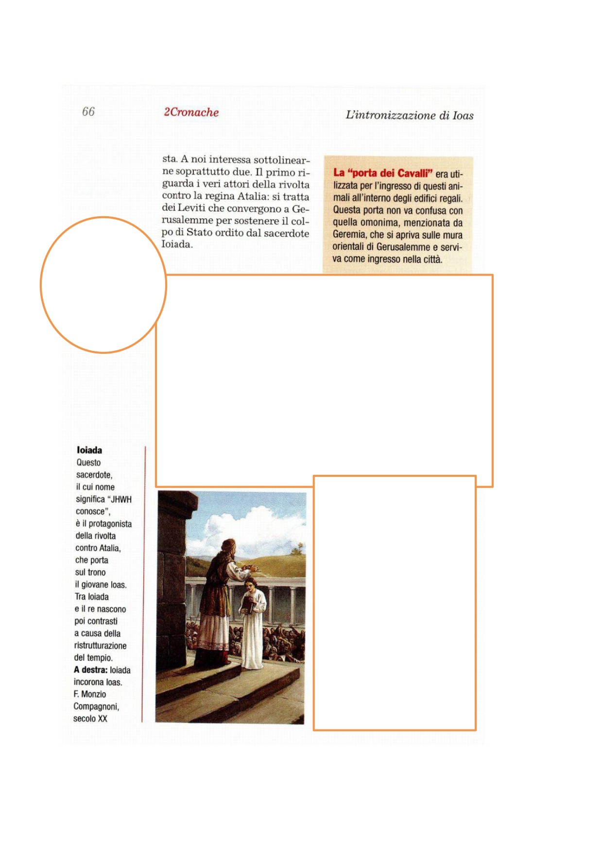 18Ioiadà affidò la sorveglianza del tempio ai sacerdoti e ai leviti, che Davide aveva diviso in classi per il tempio, perché offrissero olocausti al Signore, come sta scritto nella legge di Mosè, fra gioia e canti, secondo le disposizioni di Davide. 19Stabilì i portieri alle porte del tempio, perché non vi entrasse nessun impuro per qualsiasi motivo. 20Prese i comandanti di centinaia, i notabili e quanti avevano autorità fra il popolo, come anche tutto il popolo della terra, e fece scendere il re dal tempio del Signore. Attraverso la porta superiore lo condussero nella reggia e lo fecero sedere sul trono regale. 21Tutto il popolo della terra era in festa e la città rimase tranquilla: Atalia era stata uccisa con la spada.