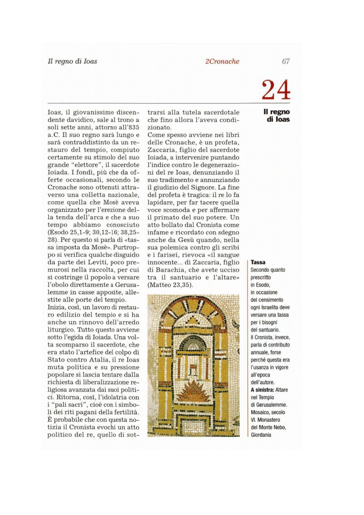 4In seguito, Ioas decise di restaurare il tempio del Signore. 5Radunò i sacerdoti e i leviti e disse loro: «Andate nelle città di Giuda e raccogliete ogni anno da tutto Israele denaro per restaurare il tempio del vostro Dio. Cercate di sollecitare il lavoro». Ma i leviti non mostrarono nessuna fretta. 6Allora il re convocò Ioiadà, il capo, e gli disse: «Perché non hai richiesto ai leviti che portassero da Giuda e da Gerusalemme la tassa prescritta da Mosè, servo del Signore, e fissata dall'assemblea d'Israele per la tenda della Testimonianza? 7L'empia Atalia, infatti, e i suoi adepti hanno dilapidato il tempio di Dio; hanno adoperato per i Baal perfino tutte le cose consacrate del tempio del Signore».