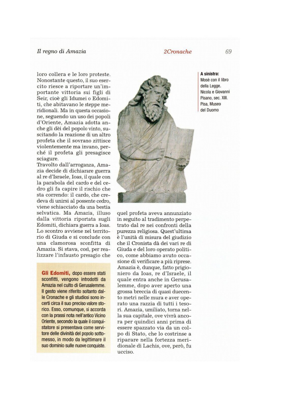 1 Quando divenne re, Amasia aveva venticinque anni; regnò ventinove anni a Gerusalemme. Sua madre era di Gerusalemme e si chiamava Ioaddàn. 2Egli fece ciò che è retto agli occhi del Signore, ma non con cuore perfetto. 3Quando il regno fu saldo nelle sue mani, giustiziò i suoi ufficiali che avevano ucciso il re, suo padre. 4Ma non fece morire i loro figli, secondo quanto è scritto nel libro della legge di Mosè, ove il Signore prescrive: «Non moriranno i padri per una colpa dei figli, né moriranno i figli per una colpa dei padri. Ognuno morirà per il proprio peccato».