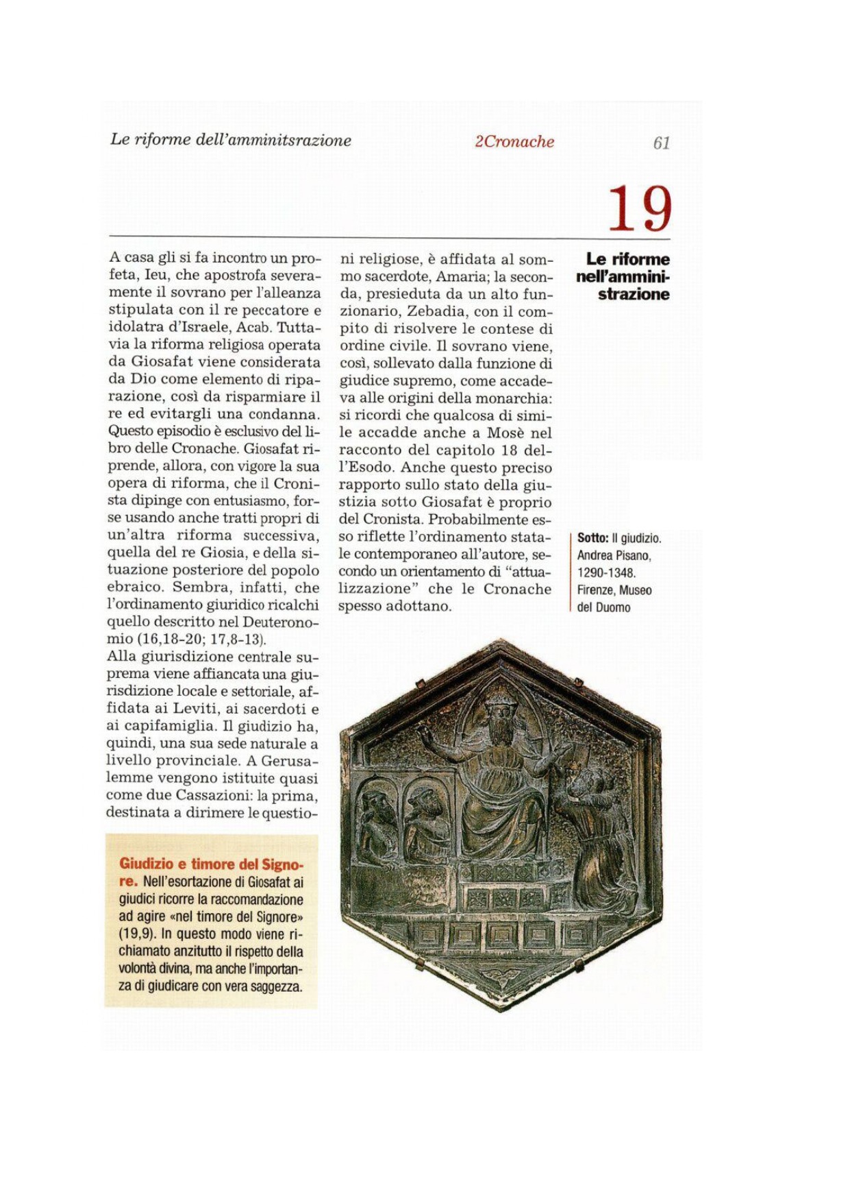 4Giòsafat rimase a Gerusalemme; poi si recò di nuovo fra il suo popolo, da Bersabea alle montagne di Èfraim, riportandolo al Signore, Dio dei loro padri. 5Egli stabilì giudici nel territorio, in tutte le fortezze di Giuda, città per città. 6Ai giudici egli raccomandò: «Guardate a quello che fate, perché non giudicate per gli uomini, ma per il Signore, il quale sarà con voi quando pronuncerete la sentenza. 7Ora il terrore del Signore sia con voi; nell'agire badate che nel Signore, nostro Dio, non c'è nessuna iniquità: egli non ha preferenze personali né accetta doni».