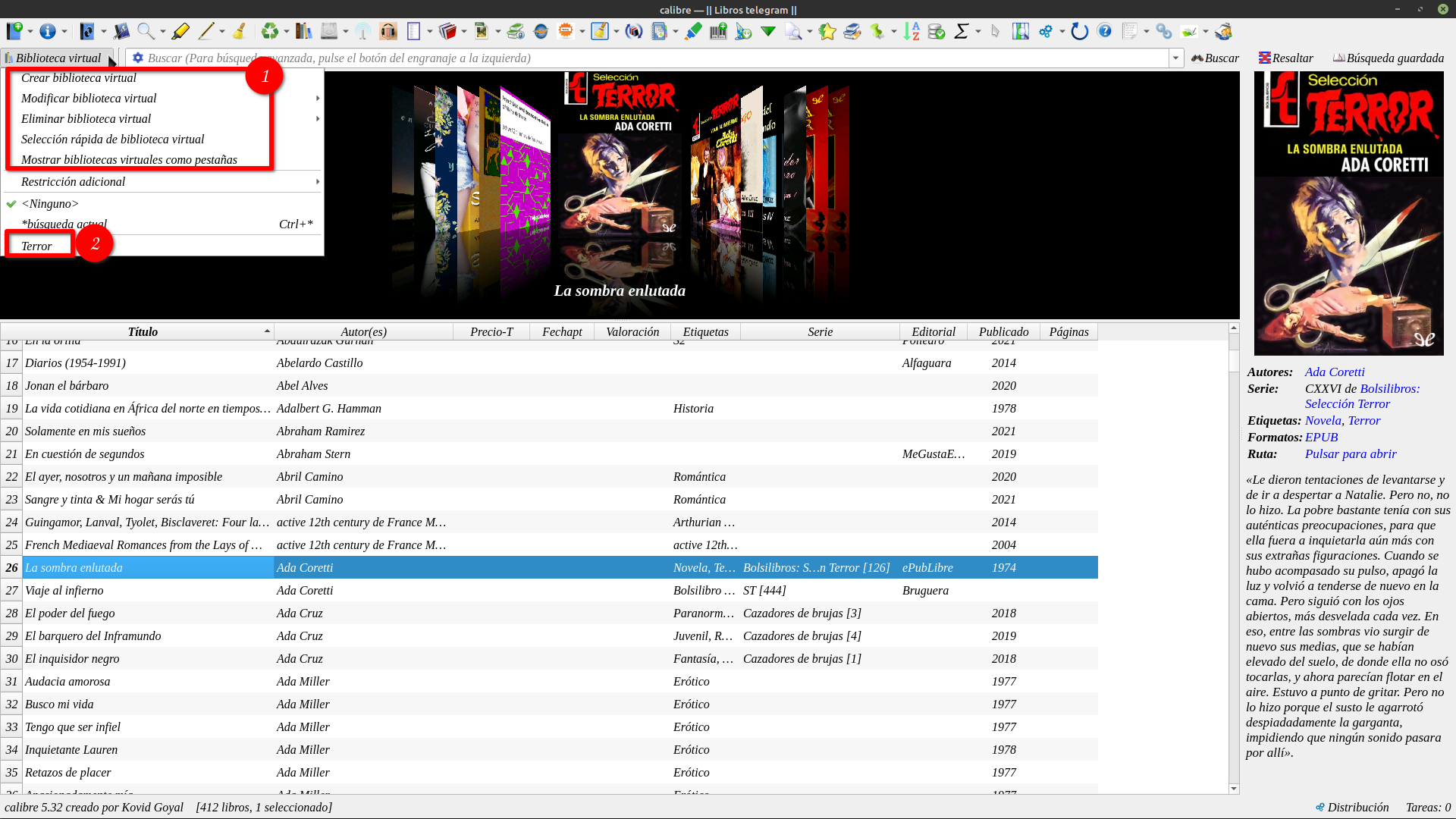 Las dos maneras son provisorias, lo que quiero decir es que si estamos trabajando con una biblioteca virtual al iniciar Calibre aparece la biblioteca "General" digamos no abre calibre con una Biblioteca Virtual.