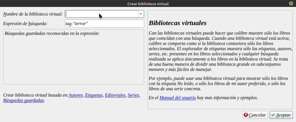 Esto funciona como un filtro que tocando en el boton de Bibliotecas Virtuales aparece un listado de las que hayamos creado.