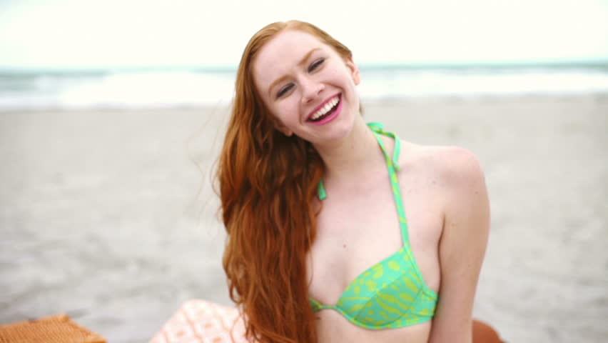Bikini Wearing Brunette Lady Caressing Hungry Muff with Smiling Face