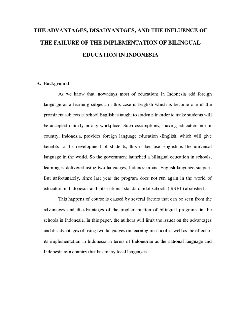 Bilingual Education , Pros & Cons ( Essay Sample) February 23, 2018 by admin Essay Samples, Free Essay Samples . Facebook 0 Twitter 0 Google+ 0 Viber WhatsApp . Bilingual Education . Introduction . Globalization has brought with it, its fair share of developments . Now, the world is more like a global village and there is need for everyone to be a . . .