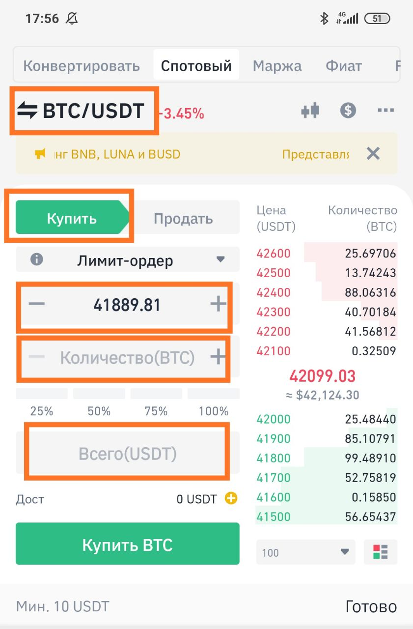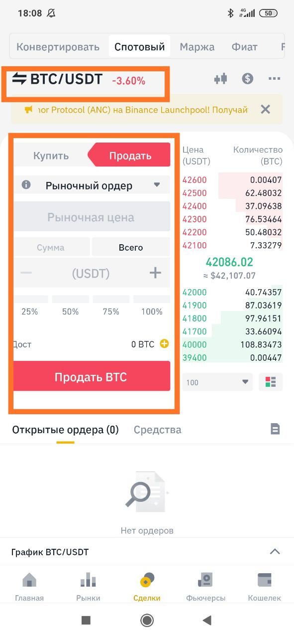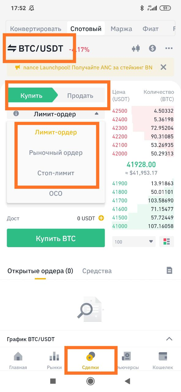 - Открываем внизу раздел "Сделки" Выбираем пару (в нашем примере это BTC/USDT) далее купить или продать. Выбираем ордер. (по умолчанию всегда стоит "Лимит-ордер"