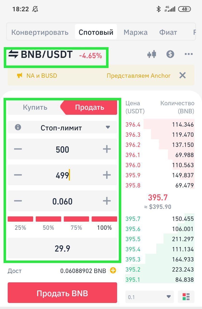 Чтобы выставить стоп-лосс, нужно выбрать тип ордера «Стоп-Лимит» на продажу. В нем необходимо заполнить три строки: «Стоп» – это цена, при достижении которой будет выставлен ордер на продажу (в указанном примере она равняется 500 USDT)