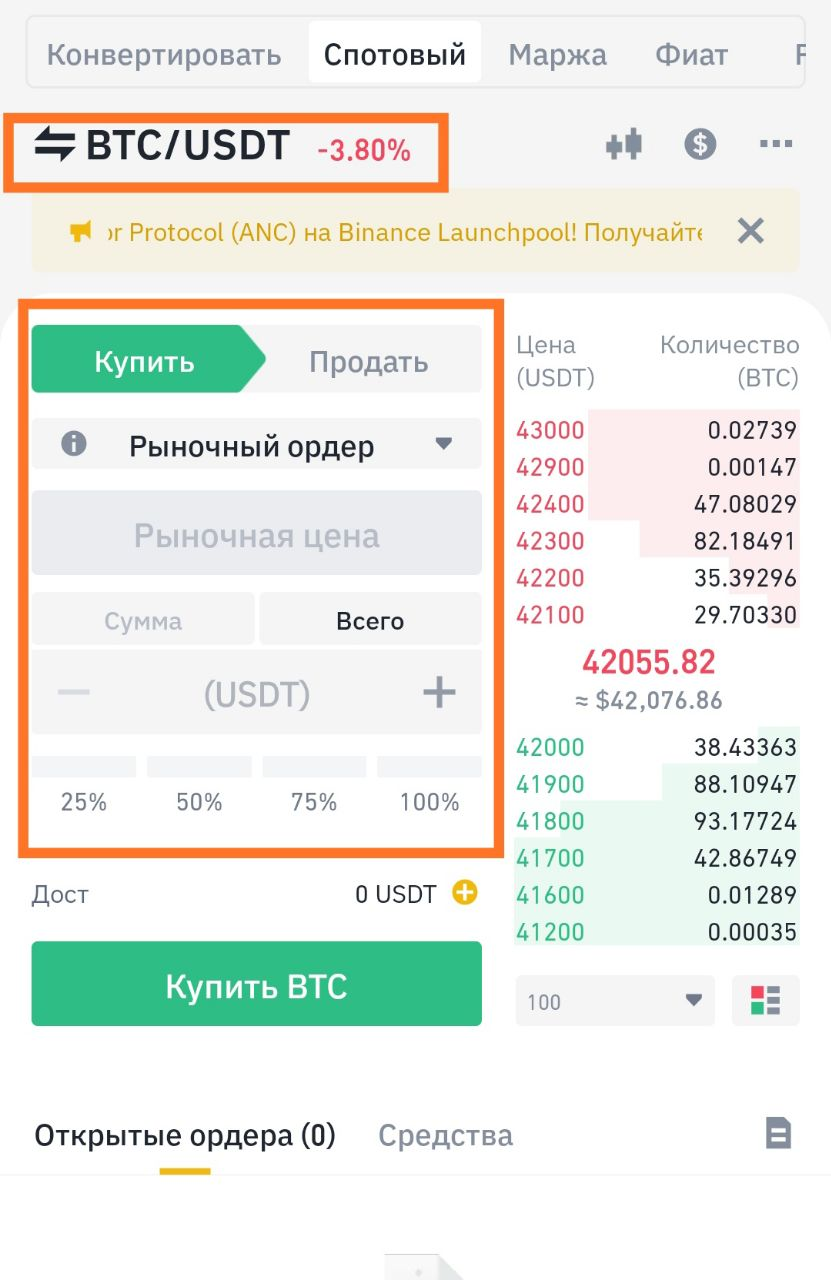 Покупка/Продажа монет. Выбираем пару (в нашем примере это BTC/USDT) Купить/Продать, далее количество монет или количтво $ (USDT) на которое хотим произвести покупку/продажу. Кнопку купить/продать. Ордер исполнится сразу по рыночной цене