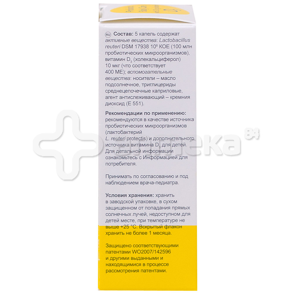 Инструкция по применению БАД БиоГая Пробиотик (BioGaia Probiotic) капли . Состав: активный ингредиент: Lactobacillus reuteri Protectis (100 млн . КОЕ жизнеспособных бактерий в 5 каплях), вспомогательные вещества: подсолнечное масло, триглицериды каприловые, агент антислеживающий: кремния диоксид . . .