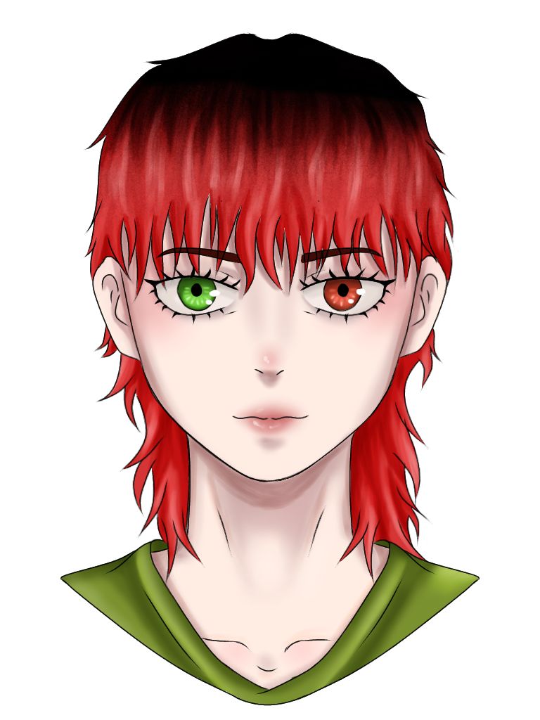 - Волосы черные с переходом в красный.