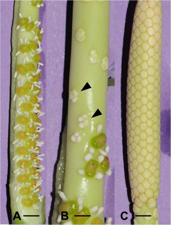 These two zones are separated by a zone of sterile male flowers . Between the sterile-male zone and the female zone there is a row of atypical bisexual flowers (Engler and Krause, 1912, p . 16; Mayo, 1986, fig . 393) . These atypical bisexual flowers (ABFs) consist of carpels and staminodes that are initiated on the same whorl (BarabΓ© et al ., 2004 . . .