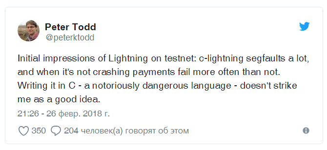 Один из разработчиков Bitcoin Core Питер Тодд (Peter Todd) отметил, что у технологии Lightning Network , решения для масштабирования сети bitcoin, есть ряд недочетов, одним из которых является внедрение «небезопасного» языка программирования C из-за частых просчетов сегментации.