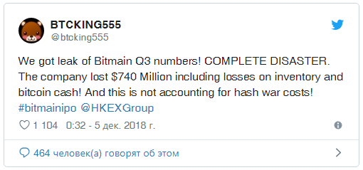 Всё началось с твита некоего BTCKING555 третьего октября. Инсайдер заявил, что у него есть информация о ещё не опубликованном финансовом отчёте Bitmain, в котором компания признала свыше 740 миллионов долларов убытка в этом квартале. Если это действительно правда, то прошедшие пару месяцев стали худшим периодом за всю историю Bitmain.