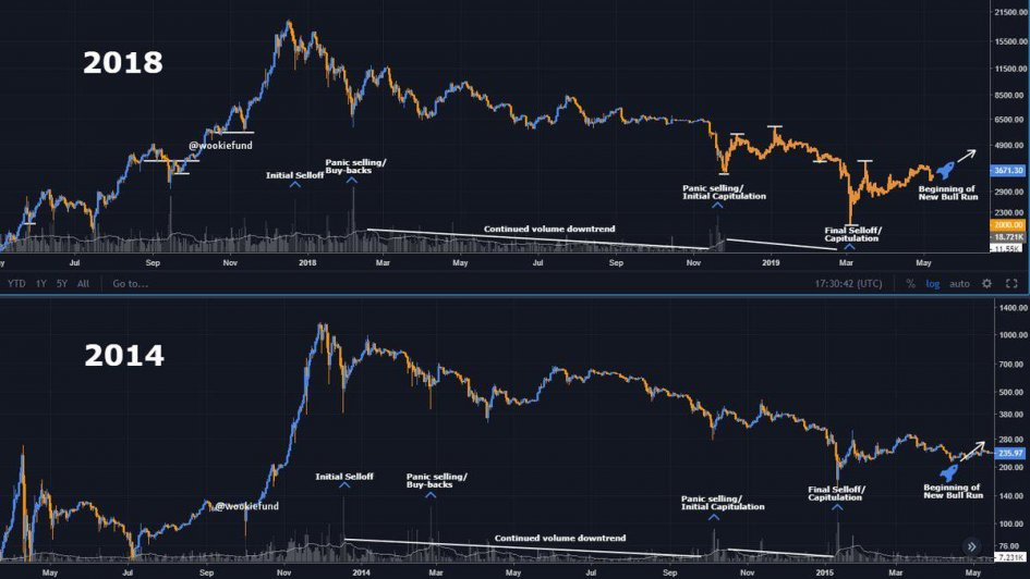 Теперь Bitcoin повторяет историю четырехлетней давности. Если сравнить текущий график криптовалюты с аналогичным за 2014 г., можно обнаружить поразительное сходство. Оно и стало спасительным маяком для некоторых инвесторов и аналитиков, теперь они делают свои прогнозы, отталкиваясь от предыдущего опыта.