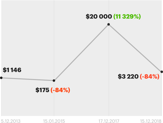 В прошлый раз нижняя отметка для криптовалюты оказалась отправной точкой: в следующие два с небольшим года Bitcoin непрерывно рос в цене, и 17 декабря 2017 г. установил исторический рекорд стоимости в $20 000. Всего за 23 месяца стоимость монеты увеличилась на 11 329%, инвесторы получили хорошую прибыль, а блокчейн-индустрия сильно шагнула вперед.