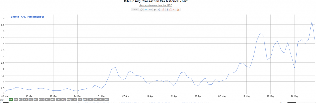 В настоящее время этот показатель находится у отметки $4, однако в последний день мая средняя величина комиссии превышала $5,5.