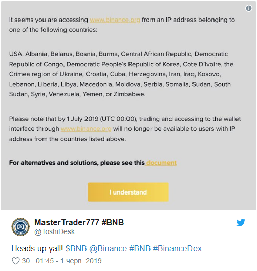 На прикрепленном к твиту скрине видно, что Binance DEX определяет IP пользователя и на этом основании решает, может ли он торговать на бирже или нет. В список недоступных для взаимодействия с платформой юрисдикций попали США, Беларусь, Молдова, Хорватия, Сербия и полуостров Крым. Новые правила вступают в силу 1 июля.