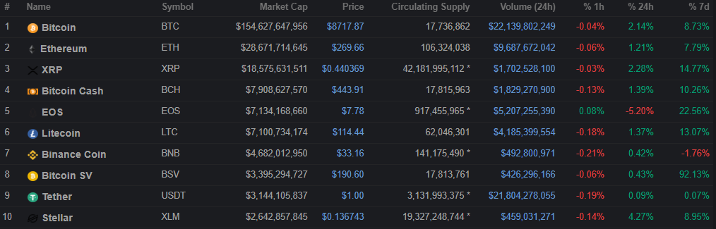 Как можно заметить, наиболее «горячим» активом в последнее время был Bitcoin SV, предположительным драйвером роста которого стали фейковые новости из Китая, создавшие мощный всплеск спроса. Аутсайдер недели — Binance Coin, который, возможно, оказался несколько перегретым после преодоления отметки в $30 и капитализации выше $4,5 млрд.
