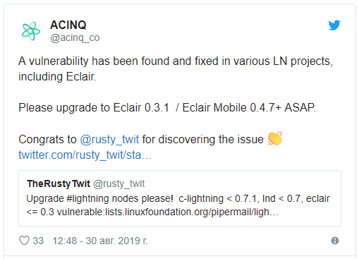 Компания ACINQ, которая разрабатывает кошелек Eclair, попросила своих пользователей максимально быстро обновиться до версии 0.3.1 или Eclair Mobile 0/4/7+.