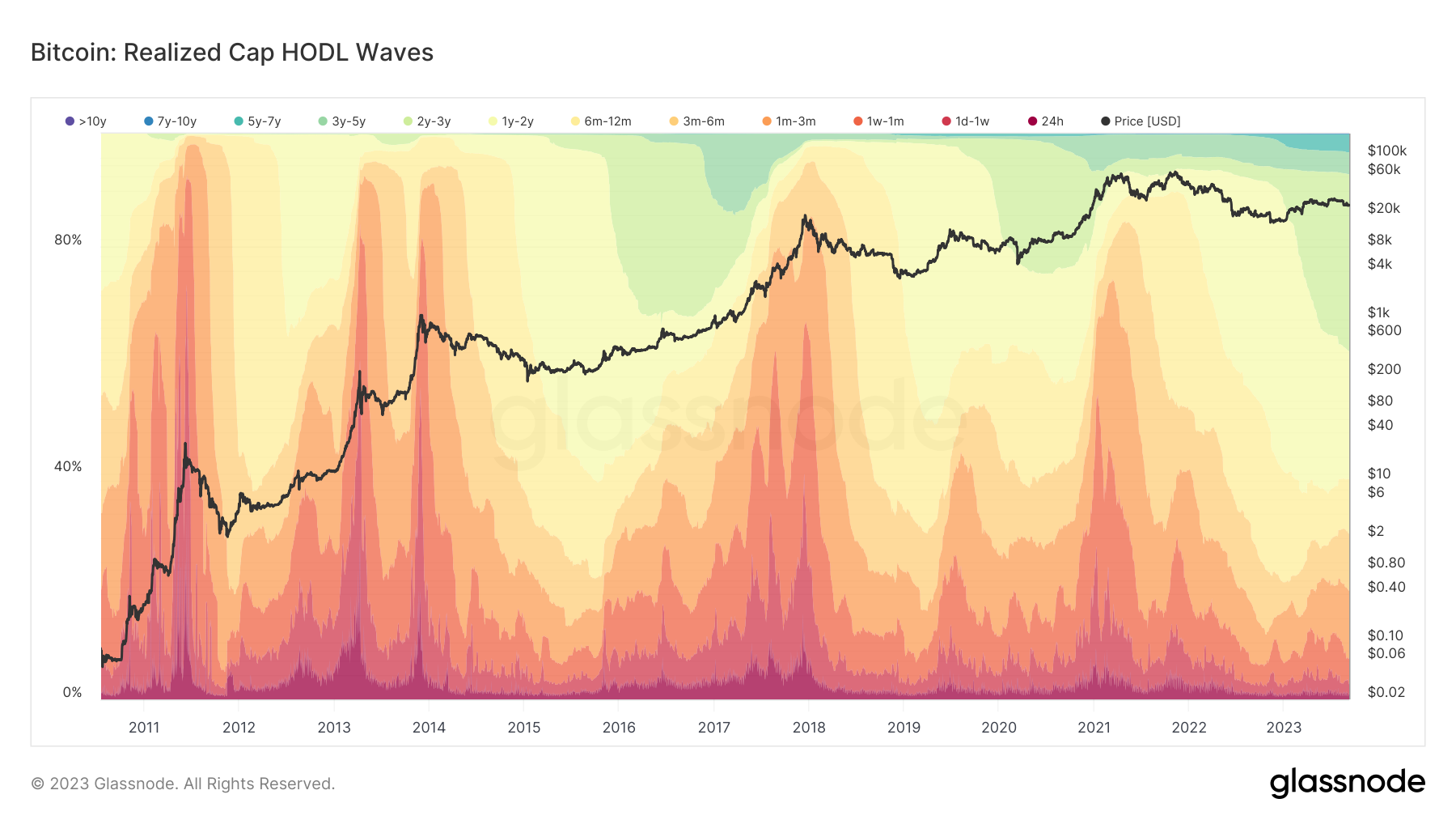 Волны Realized Cap HODL учитывают экономический вес (реализованная стоимость в долларах США) предложения монет в различных возрастных группах по отношению к Realized Cap (общая реализованная стоимость предложения монет).