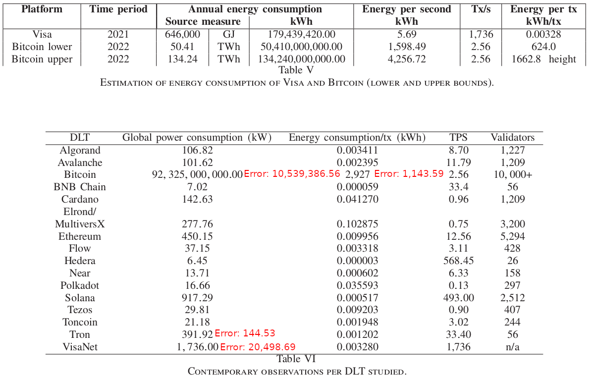 - Algorand: global energy consumption 106.82 kWh, energy per transaction 0.003411 kWh, hardware 1,193 mid-range servers.