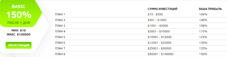 - План 1 - инвестировав от 10$ до 500$, можно получить 104% обратно - чистый доход 4% за 1 день.