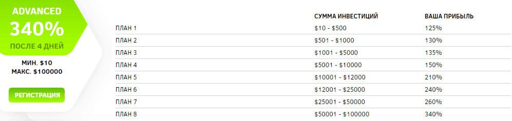 Группа тарифов под названием "Advanced" дает более ощутимый профит, но срок работы депозита увеличивается до 4 дней.