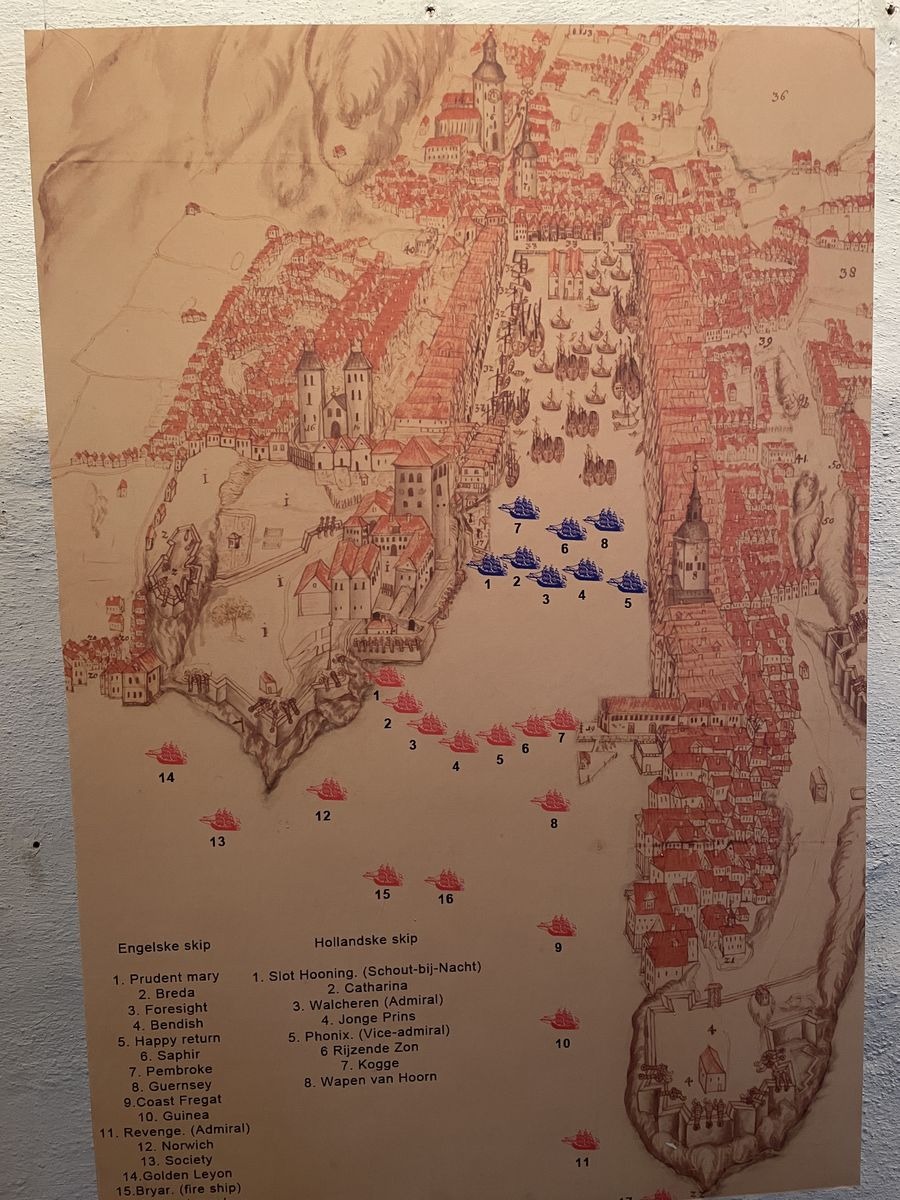 Как бы то ни было, Бергенская крепость смутно знала, что какой-то уговор с Англией должен быть. Но прямого приказа нет, а голландцы вроде как друзья, да и вообще порт нейтральный. Так что стреляем в тех, кто нарушит нейтралитет.