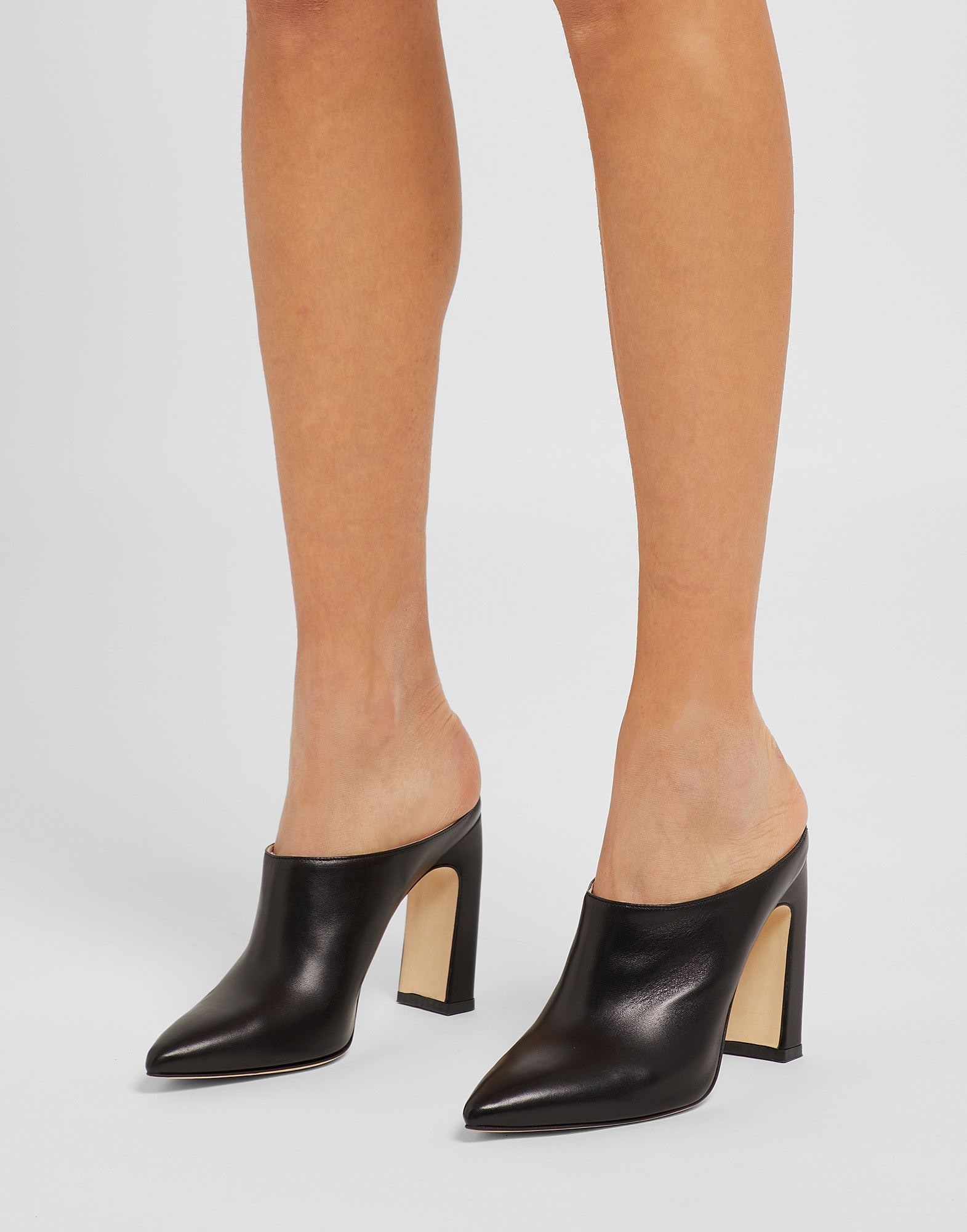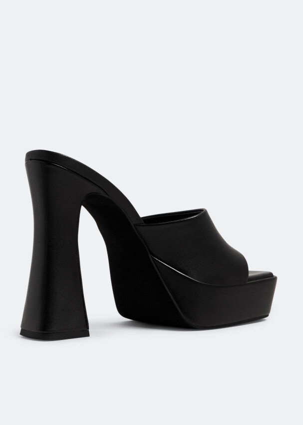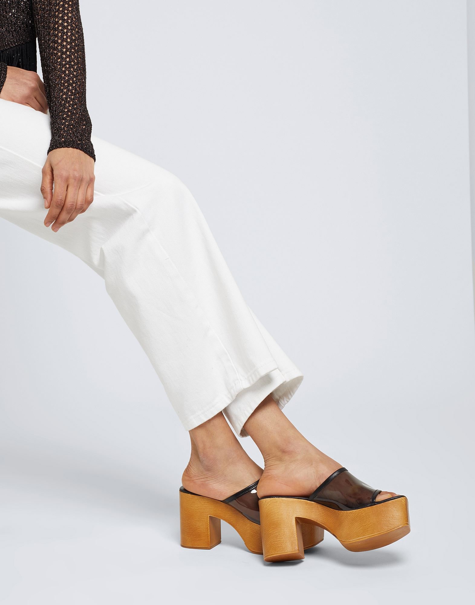 Black platform mules under table