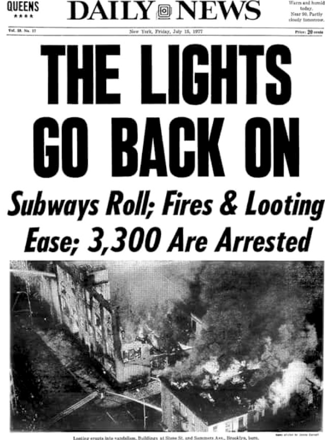 Улицы опустели, дома и машины тлели... Власти города искали виновных в отключении электричества (расследование показало, что ни чьей вины не было – природный катаклизм послужил всему бедой) и подсчитывали многомиллионные убытки, полицейским оказывали помощь медики, журналисты наперебой оперативно монтировали репортажи... и вся американская общественность задавалась только одним-единственным вопросом: ПОЧЕМУ? С этими же заголовками вышли многие ведущие нью-йоркские газеты: "Почему?" Важный лейтмотив этого вопроса: в 1965 году 9 ноября в городе уже случался подобный электрический коллапс. Тогда жители Нью-Йорка проявили солидарность, продемонстрировали высокий уровень гражданской самоорганизации — патрулирование улиц, взаимовыручка, никаких массовых волнений. В те годы ещё не произошла "американская расовая революция", она была в самом разгаре движения за права чёрных. А вот в середине-конце 70-х у чёрного населения США уже был карт-бланш на любые действия. 80-е станут криминальным пиком в разгуле уличных банд Америки. Сопоставляйте, делайте выводы сами...