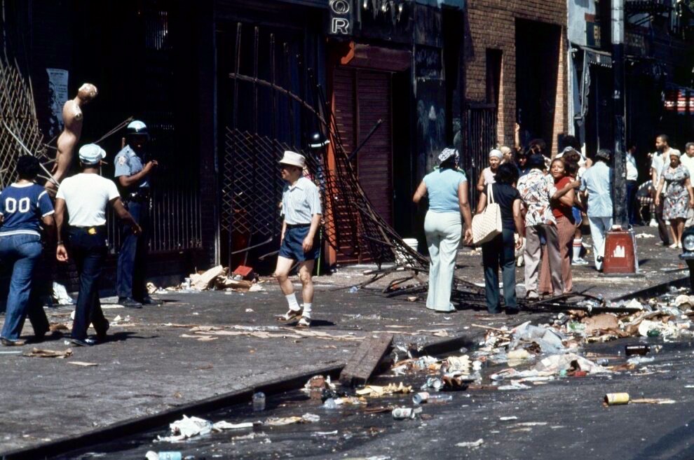 В то время как власти города тщетно пытались восстановить энергоснабжение, а белое население помогало друг другу по мере необходимости и возможностей (как вот случай, когда группа мужчин вручную (!) провернула колесо обозрения Кони-Айленда, чтобы освободить застрявших людей), чёрные были заняты своими делами – грабежами и подожгами. Беспредел и дикость охватили Бронкс, Гарлем, Бруклин, Куинс и Бродвей – эти районы тотально находились во власти бесновавшейся толпы. Первым делом грабежу подверглись магазины бытовой техникой, затем в разнос пошли автосалоны, ювелирные лавки, магазины одежды, и уже только в самом разгаре угара беззакония и безнаказанности обезумевшие чёрные добрались до аптек и продовольственных супермаркетов. Это к разговору о приоритетах и нужде маргинальных слоёв общества из гетто.