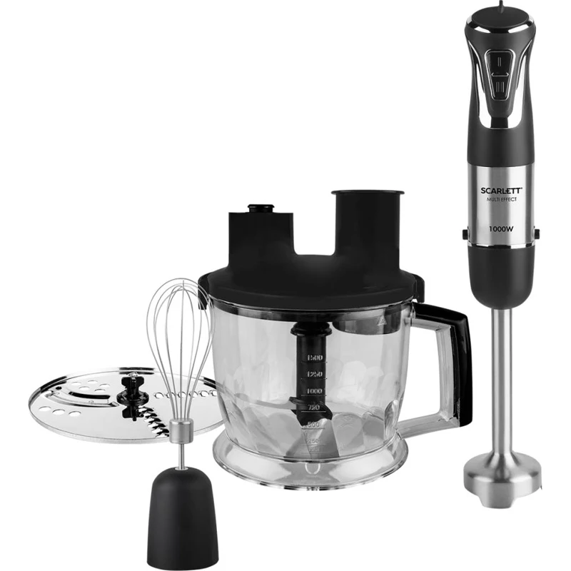 Погружной блендер Scarlett SC -HB42F65 оснащён мощным мотором 700 Вт, к нему прилагается мини-измельчитель и венчик, с помощью которых можно измельчать продукты, готовить тесто, взбивать крем, выполнять другие задачи .