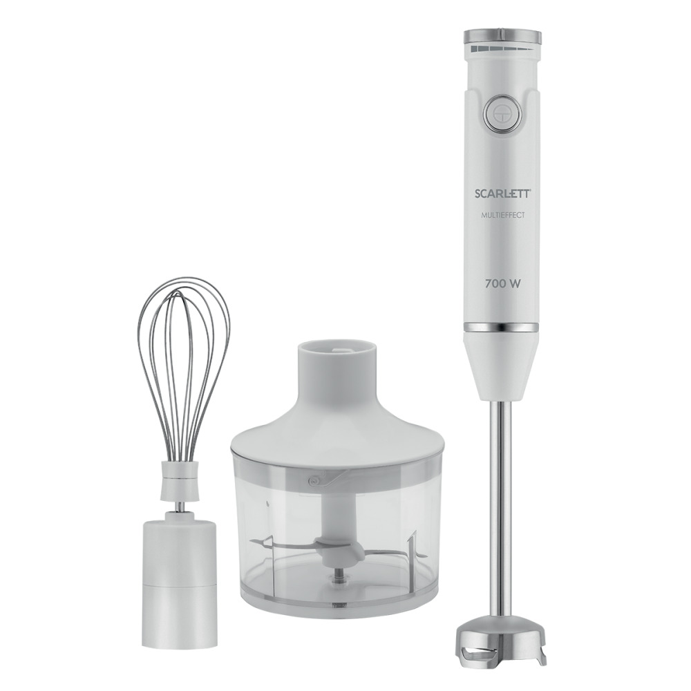 Погружной блендер Scarlett SC-HB42F91 оснащён мощным мотором 700 Вт, к нему прилагается измельчитель и венчик, с помощью которых можно измельчать продукты, готовить тесто, взбивать крем, выполнять другие задачи .