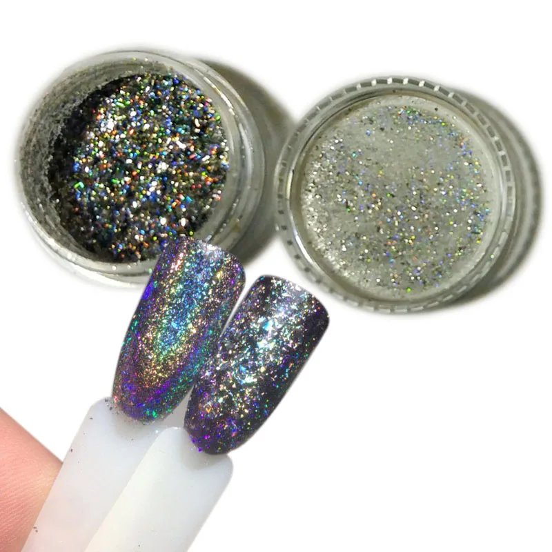 Гель-лак (9 мл) на прозрачной подложке, с серебристыми и голографическими блестками, полупрозрачный.