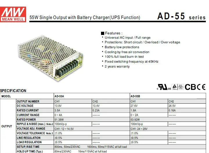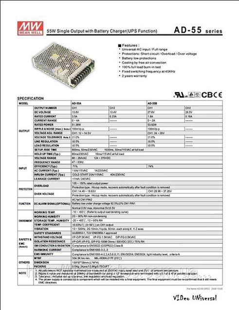 AD-55A Производитель: MEAN WELL USA Inc . Description: AC/DC CONVERTER 13 .8V 13 .4V 51W Approval Agency: CB, CE, cURus, TUV Size / Dimension: 6 .26" L x 3 .82" W x 1 .50" H (159 .0mm x 97 .0mm x 38 .0mm) Mounting Type: Chassis Mount Features: Adjustable Output, Universal Input Operating Temperature:-10°C ~ 60°C (With Derating) Efficiency: 71% Voltage - Isolation: 3kV