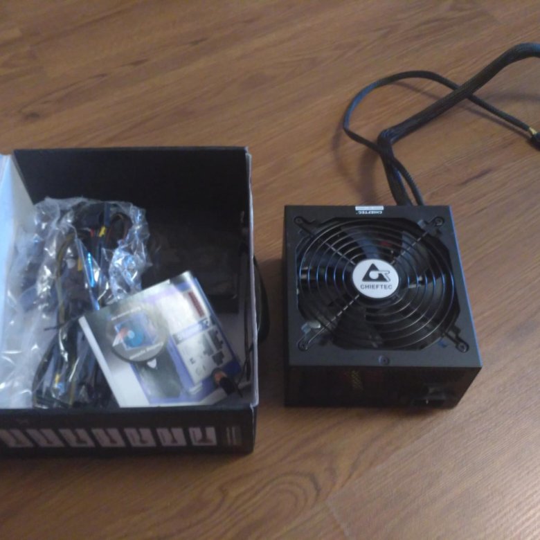 Внутри картонной коробки блок питания chieftec cft -600- 14cs и его комплектация уложены очень плотно . Комплектация при этом включает модульные кабеля, сетевой шнур питания, четыре винта и инструкцию .